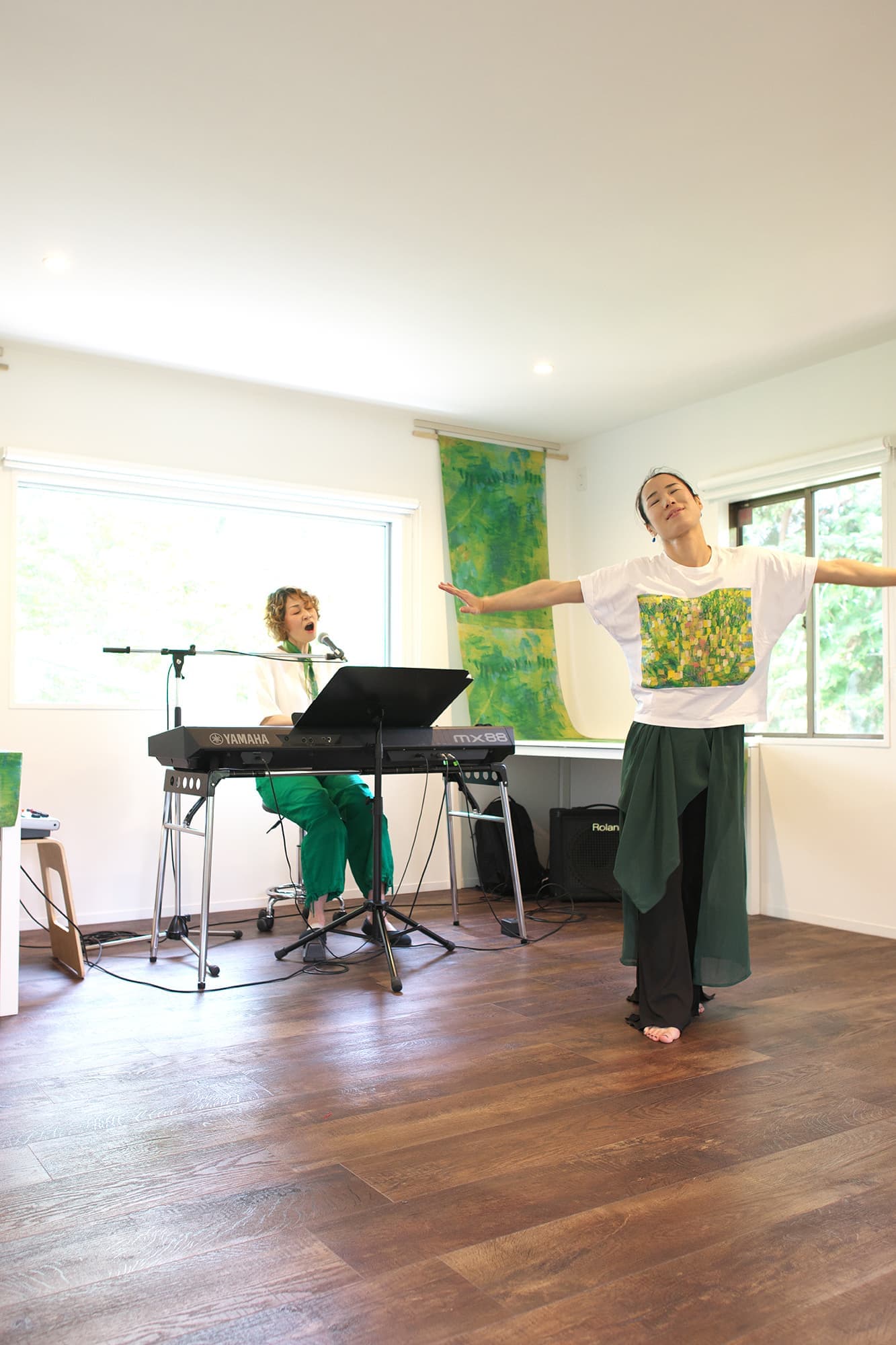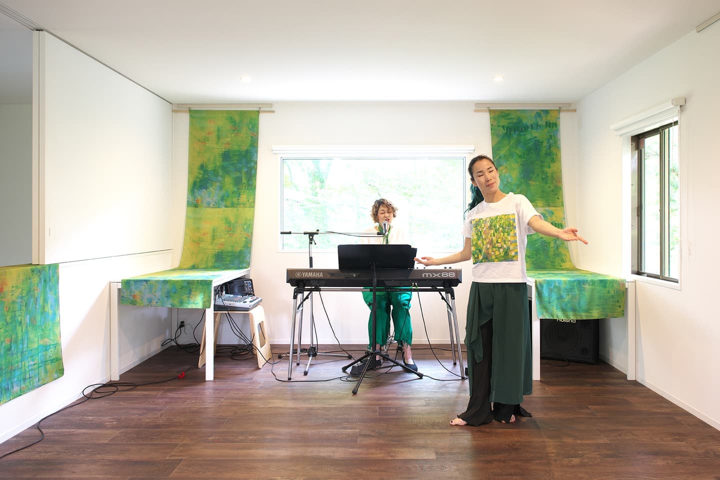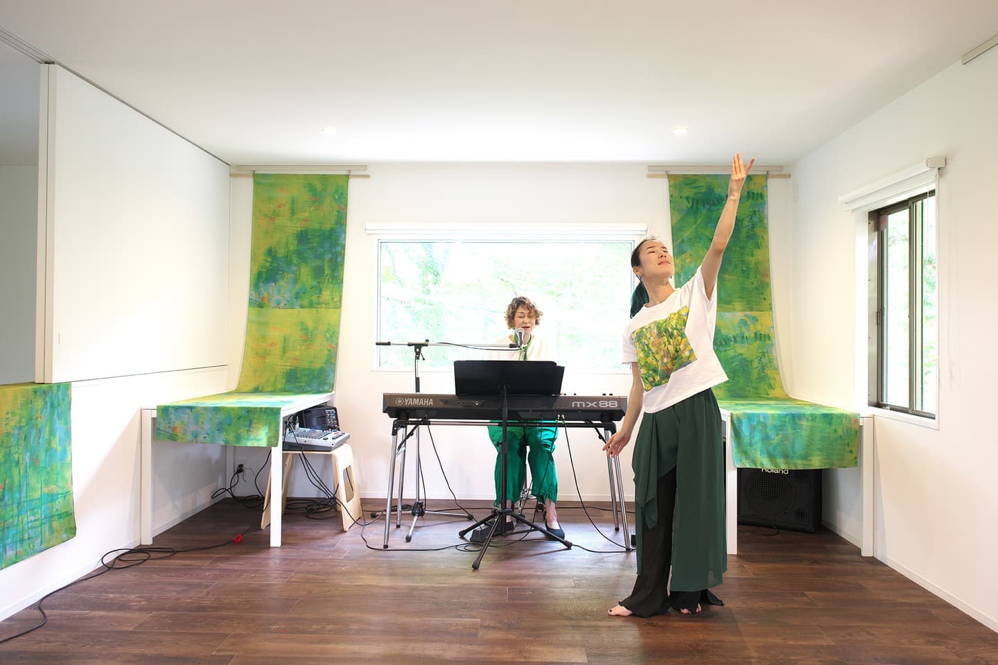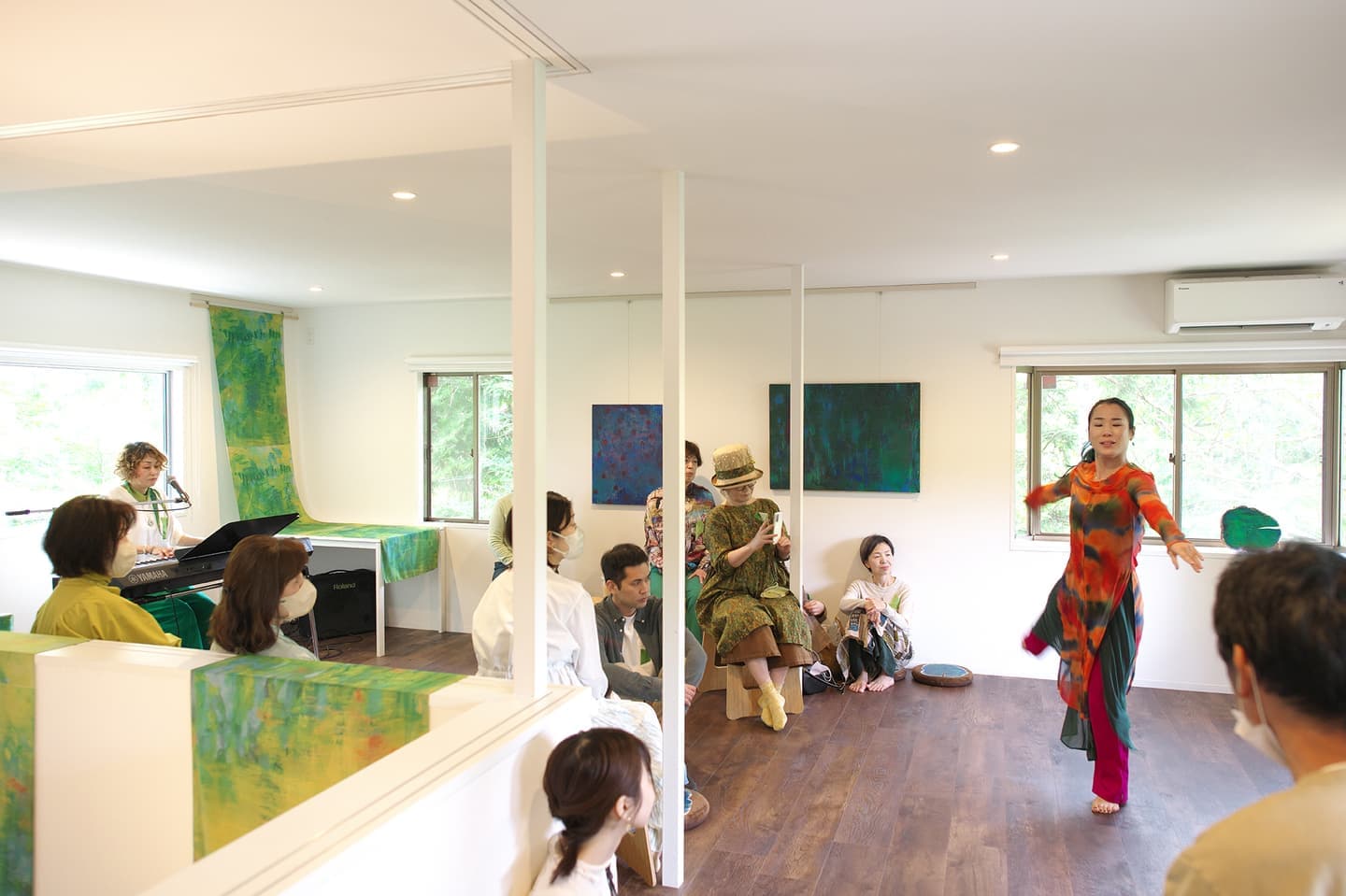 音楽家 中田理恵子×画家 柳田歳子がお互いにインスパイアされてできた [pictorial sound] そこにダンサーKaNaが加わったアートパフォーマンスイベント[sora森]